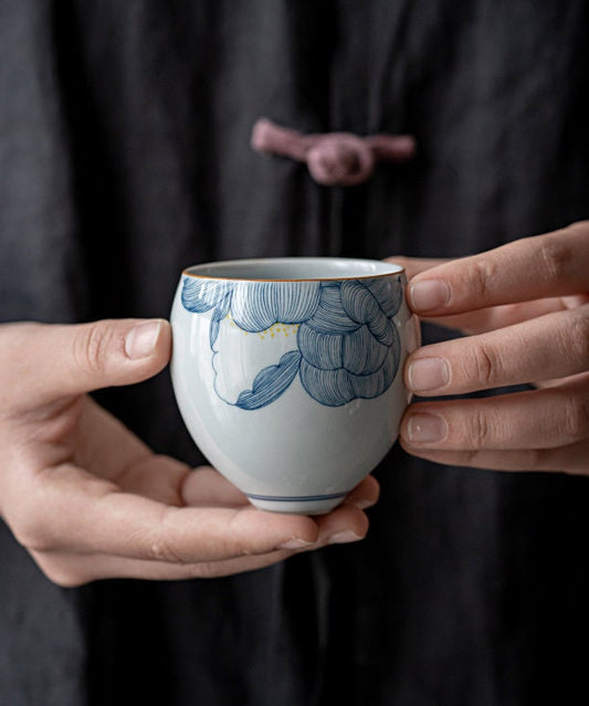 Hand Painted Peony Flower Gongfu Tea Cups 100ml /3.4oz, Wood-Fired Blue White Master Tea Cup Set, Chinese tea Cups, 2 Styles, Tea Lover Gift