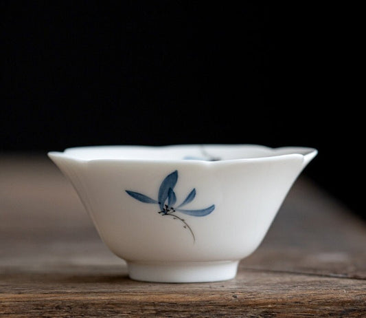 Flower Shape Kung Fu Tea Cup 55ml/1.86oz, Hand Painted Orchid White Porcelain Tea Cups for Gong Fu Tea Ceremony / Small Chinese Tea Cups