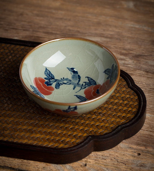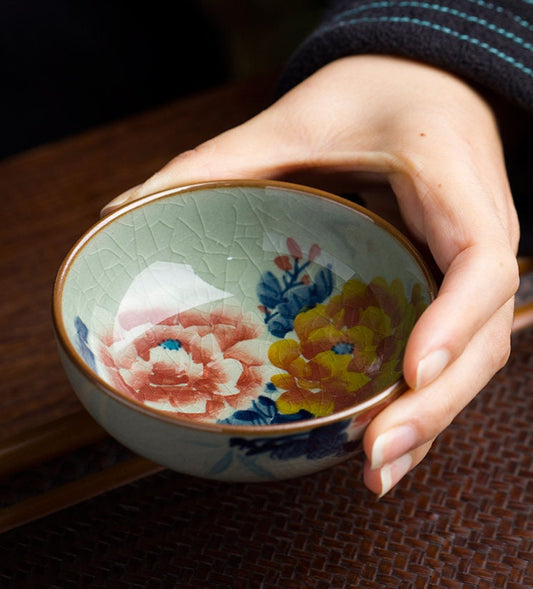 Hand Painted Peony Flower Gongfu Tea Cups 90ml /3oz, Wood-Fired Blue White Pu-erh Tea Cup, Chinese tea Cups, Gift for Kungfu Tea Lovers