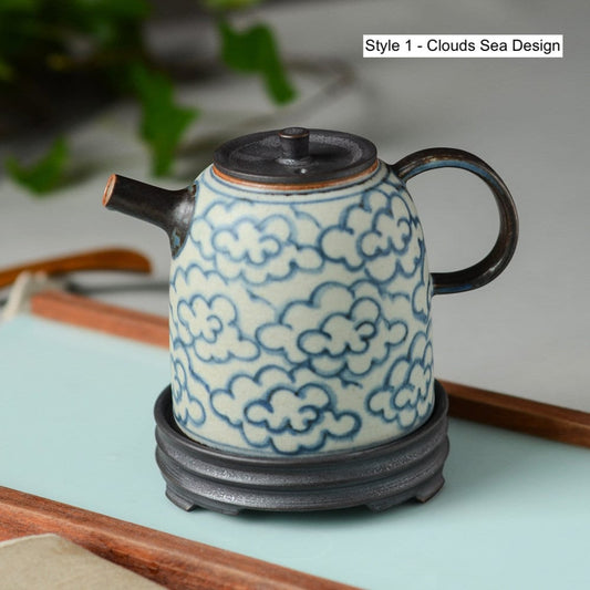 Handmade Chinese Blue & White Ceramic Teapot with Stand, Hand Painted Teapot 200ml/6.8oz, 2 Designs - Clouds Sea and Ocean Waves