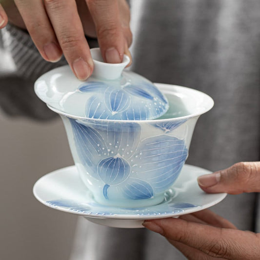 Hand Painted Lotus Gaiwan 150ml/5oz, Pile Carving Lotus Porcelain Gaiwan, Shadowy Green Glaze, Handmade, Pu-Erh Tea, Gift to Tea Lovers