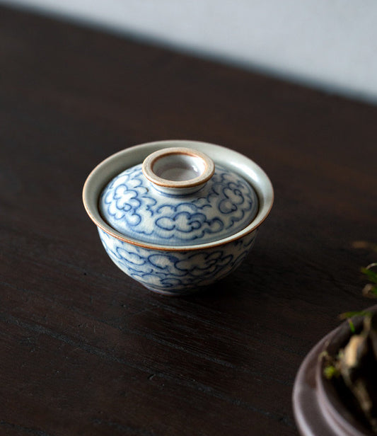 Hand Painted Lucky Clouds Gaiwan 120ml/4oz, Fanggu Style Blue White Small Gaiwan for Loose Leaf Tea, Chinese Tea Brewing Vessel Gongfu Tea