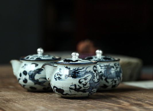 Hand Thrown Stoneware Gongfu Teapot 140-180ml, Hand Painted Blue White Dragon Hand Grab Teapot, Jingdezhen, Gift for Tea Lovers, 3 Patterns