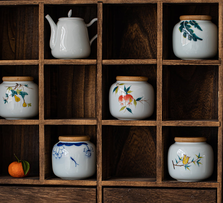 Fine ceramic tea canisters and jars store loose-leaf tea, preserving its freshness....