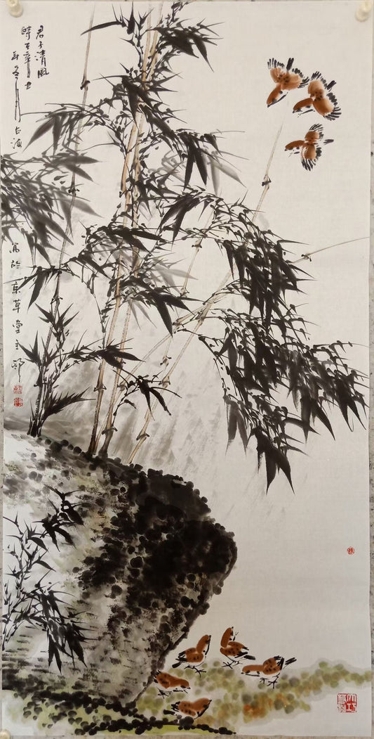 Original Chinese ink Painting of Sparrows in Bamboo 27″x54″, Oriental Art, traditional Chinese ink and wash painting - Bamboo, Sumi-e Bamboo