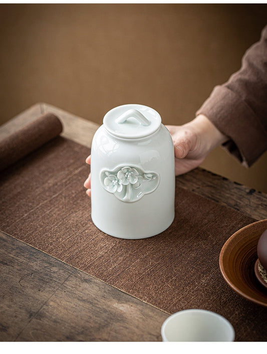 Hand Painted Lotus Ceramic Canisters, Pile Carving Lotus Tea Container for Loose Leaf Tea, Tea Caddy, Ceramic Tea Jars, Gift to Tea Lovers