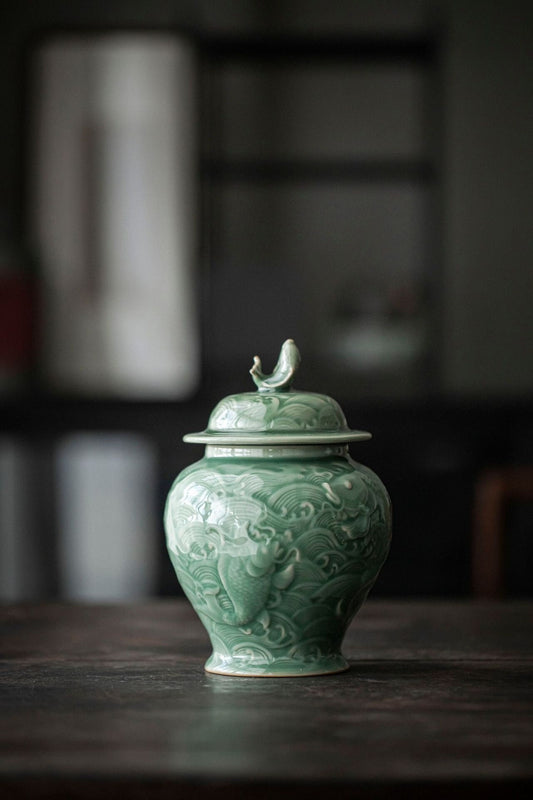 Engraved Fish Waves Ceramic Tea Caddy 770ml/1390ml (26oz/47oz), Tea Canister Storing Loose Leaf Tea, Asian Style, Tea Tin, 2 Sizes 3 Colors