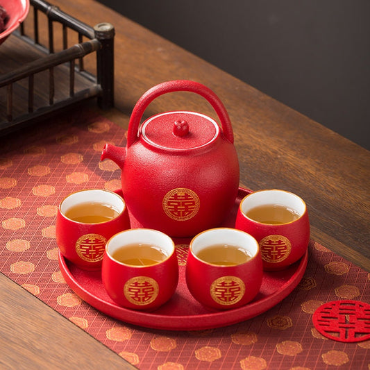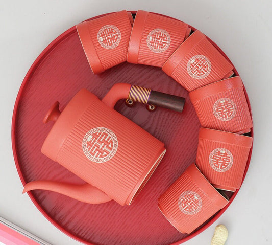 Chinese Wedding Tea Set, Double Happiness Wedding Tea Ceremony Set, Red Ceramic Tea Set with 1 Teapot and 6 Cups, Chinese Wedding Gift