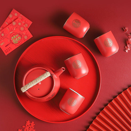 Oriental Wedding Tea Ceremony Set, Double Happiness Wedding Tea Set, Red Ceramic Tea Set with 1 Teapot, 4 Cups and 1 Tea Tray, Wedding Gift