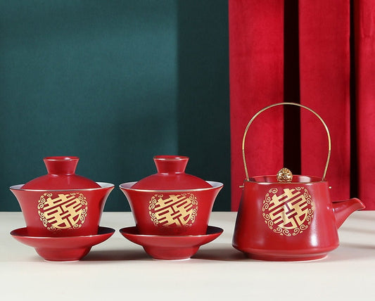 Double Happiness Wedding Tea Ceremony Set, Oriental Wedding Gaiwan Tea Set, Chinese Wedding Tea Set, Red Teapot Set